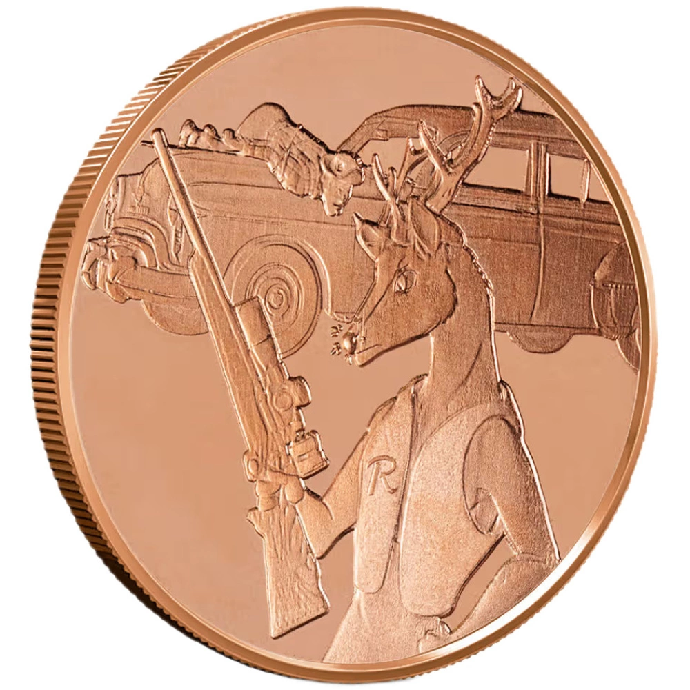 Deer Hunter – Christmas is Cancelled 1 Unze Kupfer ist eine ungewöhnliche, humorvolle Weihnachtsmedaille aus 1 Unze .999 Feinkupfer. Ihr subversives Thema knüpft an klassische Geschichten über die Rentiere des Weihnachtsmanns an, präsentiert sie jedoch in einer völlig neuen, überraschenden Perspektive. Das dynamische Design, kombiniert mit hoher Verarbeitungsqualität, macht diese Ausgabe zu einer interessanten Ergänzung für Anlasssammlungen sowie zu einer Option für Liebhaber humorvoller, weihnachtlicher Motive.