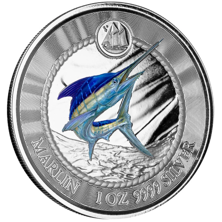 Auf der Rückseite der Münze ist ein farbiger blauer Marlin abgebildet. Auf der Rückseite sind die Aufschrift MARLIN" sowie das Gewicht und der Feingehalt des Barrens angegeben.