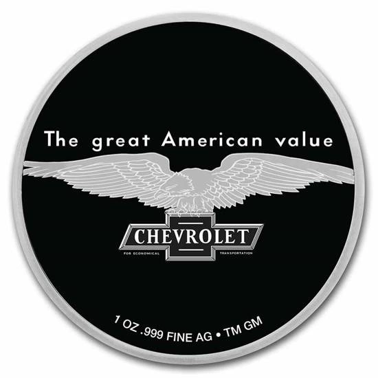 Die Vorderseite der Münze zeigt die Aufschrift "THE GREAT AMERICAN VALUE" und das Chevrolet-Logo. Auf der Vorderseite befinden sich außerdem Informationen über das Gewicht und den Reinheitsgrad des Barrens.