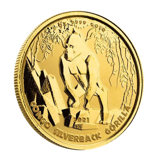 Moneta Congo: Goryl srebrnogrzbiety 1 uncja Złota 2021 to inwestycyjna moneta, która ukazuje goryla srebrnogrzbietego. Zwierze jest uważane za króla dżungli i posiada wielkie uznanie w stadzie. Goryl to ssak roślinożerny, który może ważyć nawet 200kg. Walor pochodzi z serii The Silverback Gorilla. W 2021 roku ukazała się siódma srebrna moneta przedstawiająca Goryla srebrnogrzbietego oraz pierwsza złota moneta z serii.
