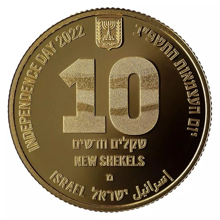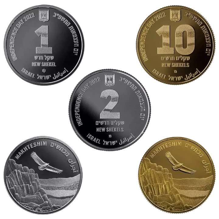 Die Vorderseiten zeigen das Wappen Israels und die Aufschrift "INDEPENDENCE DAY 2022". Auf den Vorderseiten sind Informationen über den Nennwert, das Jahr und das Herkunftsland in Hebräisch, Englisch und Arabisch angegeben.
