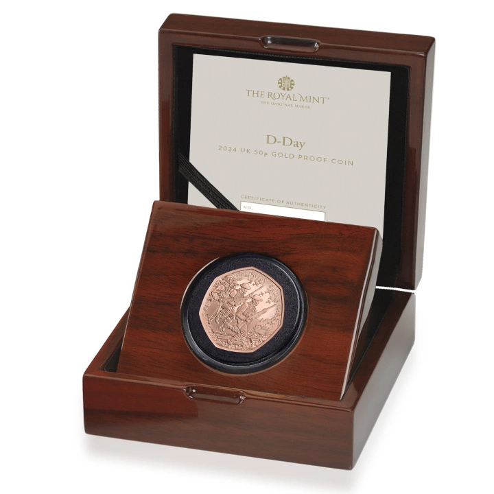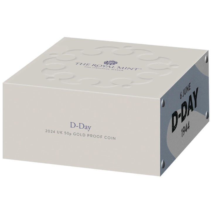 D-Day 50p Gold 2024 Proof ist eine Gedenkmünze zum 80. Jahrestag des D-Day. Am 6. Juni 1944 griffen mehr als 132.000 Bodentruppen und 18.000 Fallschirmjäger erfolgreich fünf Landungsstrände entlang der Küste der Normandie in Frankreich an. Die Einnahme des Landekopfes auf dem europäischen Festland ermöglichte es den Alliierten, eine zweite Front gegen Deutschland zu eröffnen und trug dazu bei, das Schicksal des Zweiten Weltkriegs zu verändern.