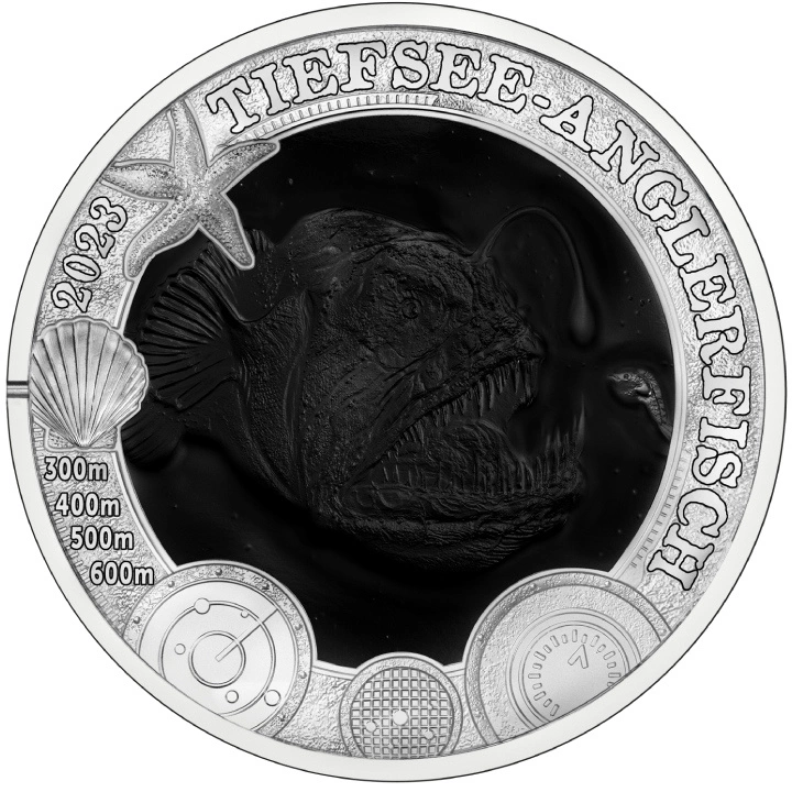 Rückseiten zeigen einen farbigen Seeteufel, die Aufschrift "TIEFSEE-ANGLERFISCH" und das Prägejahr der Münze. Die Rückseite der Münze leuchtet im Dunkeln.