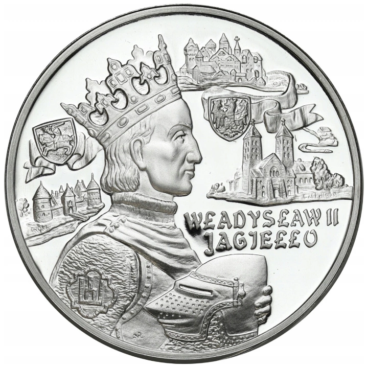 Die Vorderseite zeigt eine Büste von König Władysław Jagiełło mit Burgen und Festungen im Hintergrund und der Inschrift „WŁADYSŁAW JAGIEŁŁO“.