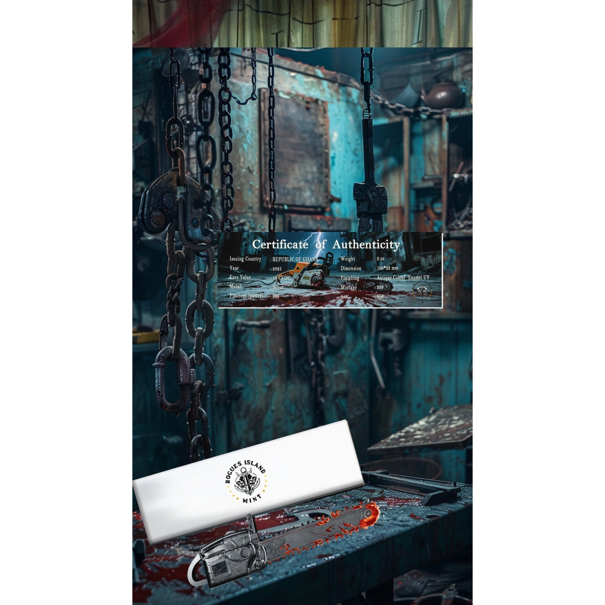 Ghana: Bloody Chainsaw koloriert 2 Unzen Silber 2025 Antiqued Shaped Coin
