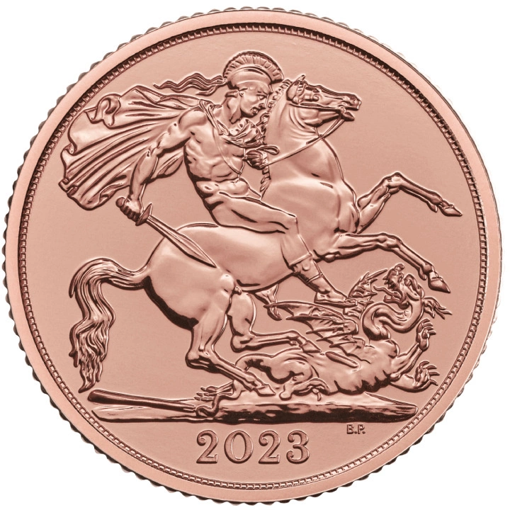 Die Umschläge zeigen die Szene, in der der Heilige Georg den Drachen erschlägt. Das Ausgabedatum ist ebenfalls auf der Unterseite der Goldmünze angegeben. Der Designer der Rückseite war Benedetto Pistrucci.