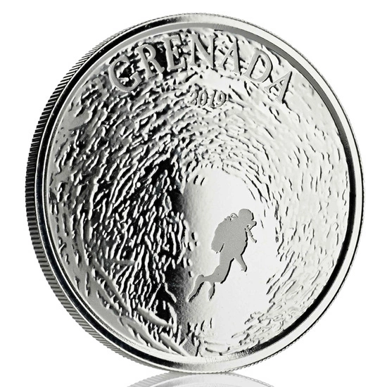 Die 2019 Grenada: Diving Paradise 1 Ounce Silbermünze ist ein einzigartiges Produkt, das einen Taucher inmitten eines dichten Fischschwarms zeigt. Das Produkt stammt aus der Serie Eastern Caribbean 8.