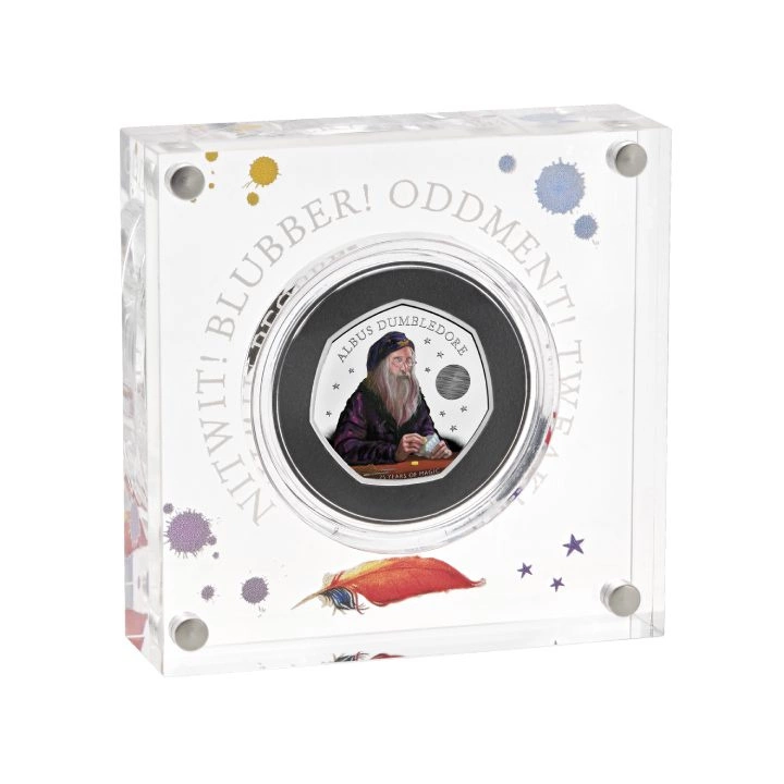 Harry Potter: Albus Dumbledore coloured 50p Silver 2023 Proof ist ein einzigartiges Valentinsgeschenk an die Erstausgabe des Bandes Harry Potter und der Stein der Weisen, der am 26. Juni 1997 in Großbritannien seine Weltpremiere feierte. Das Buch feierte 2022 sein 25-jähriges Jubiläum und ist der erste Teil einer siebenbändigen Romanreihe, in der die Hauptfigur Harry Potter gegen das Böse in der Zaubererwelt antritt.