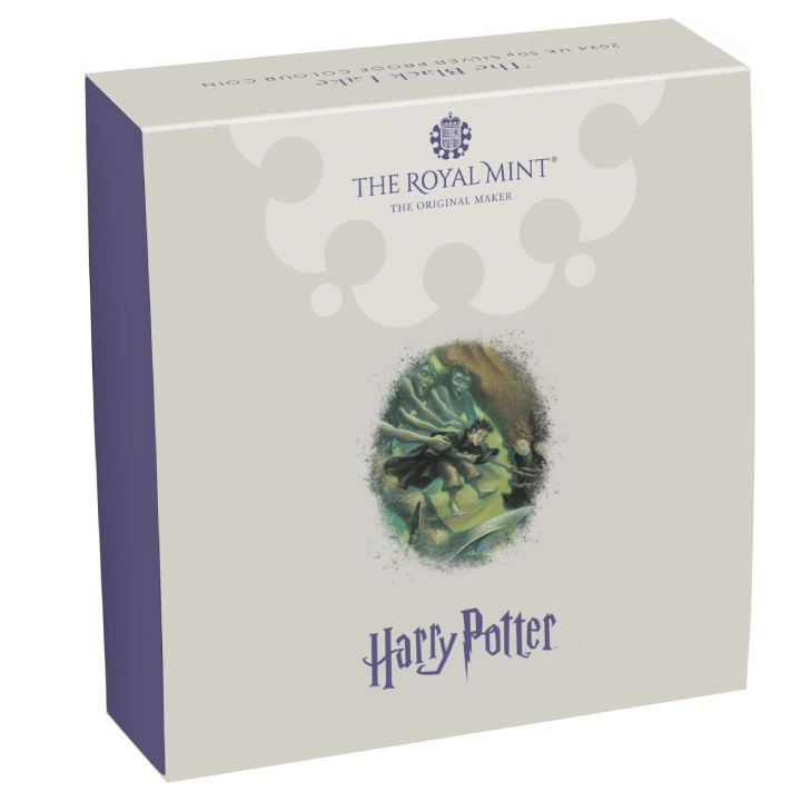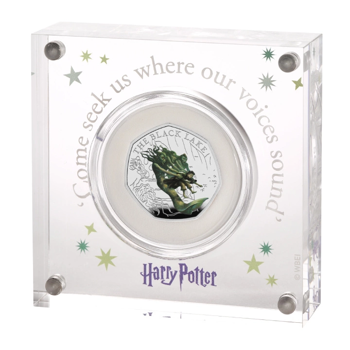 Harry Potter: Black Lake Kolorierte 50p Silber 2024 Proof erinnert an eines der denkwürdigsten Ereignisse aus Harry Potters viertem Jahr an der Schule für Hexerei und Zauberei in Hogwarts – die zweite Aufgabe des Trimagischen Turniers. In dieser besonderen Ausgabe wird der junge Zauberer in einem Schlüsselmoment dargestellt, als er mutig in die dunklen Tiefen des Schwarzen Sees eintaucht, um einen wertvollen Schatz zurückzuholen, der von den Meerjungfrauen gestohlen wurde.