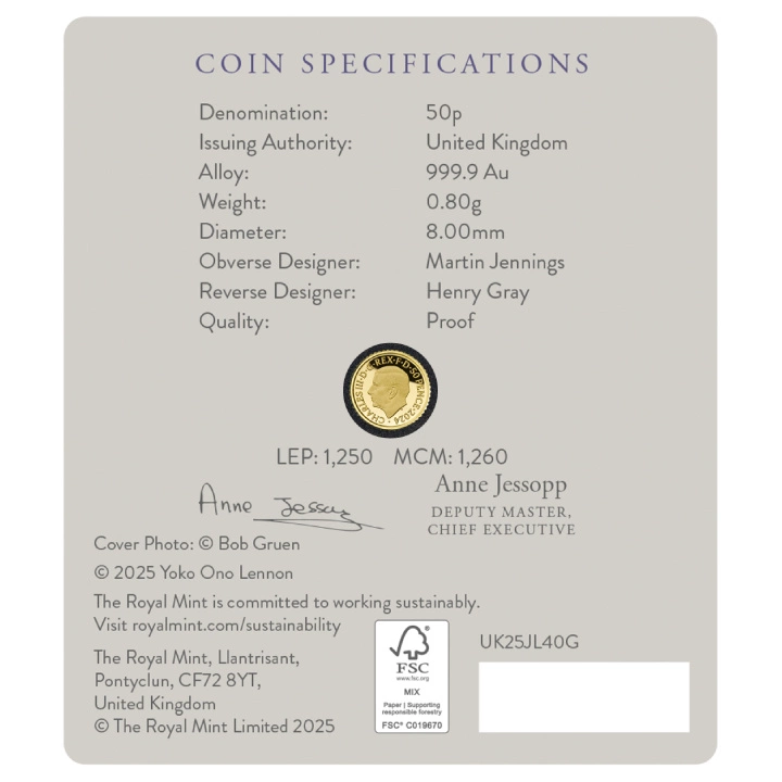 Die Münze wird aus .9999 Feingold geprägt, wiegt 1/40 Feinunze und hat einen Durchmesser von 8 mm in Proof-Qualität. Die Auflage ist auf 1.250 Exemplare begrenzt. Zusätzlich wurde diese außergewöhnliche Münze von der Royal Mint produziert. Das Produkt befindet sich in seiner Originalverpackung. Die Münze wird von der britischen Regierung garantiert, was ihre Rechtmäßigkeit, Metallreinheit und Herkunft sichert, und ist in ihrem Ausgabeland gesetzliches Zahlungsmittel.