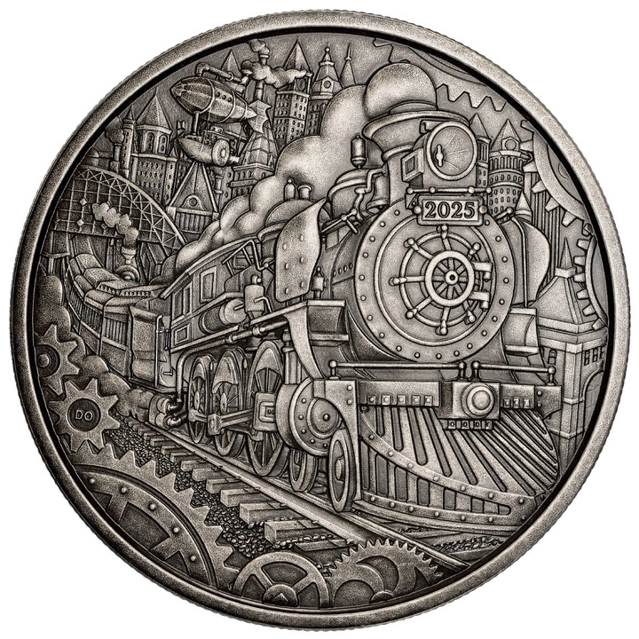Die Münze besteht aus 3 Unzen 99,99% reinem Silber und gehört zu einer limitierten Auflage von 2.500 Exemplaren weltweit. Der geriffelte Rand betont den industriellen Look, während das antike Finish eine dezente Patina erzeugt und das Aussehen von gealtertem Metall und Maschinen unterstreicht. Zahlreiche gravierte Details, wie Zahnräder, erscheinen sowohl auf der Rückseite als auch auf der Vorderseite und bilden ein attraktives Steampunk-Motiv.