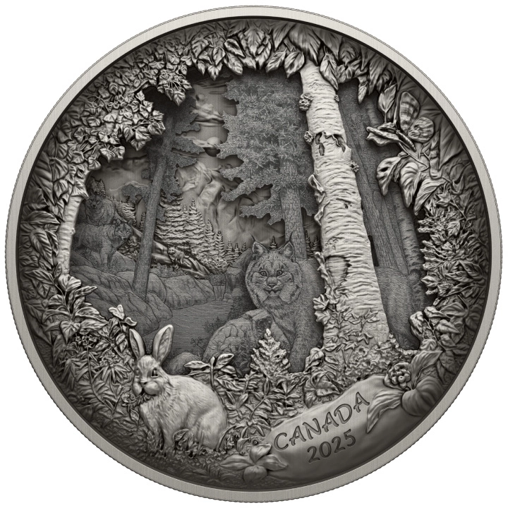 Rückseite der Münze zeigt eine dynamische, mehrschichtige Szene, die mit üppiger Flora und versteckter Fauna gefüllt ist und die Komplexität der Beziehung zwischen Räubern und ihren Opfern symbolisiert. Das Design, geschaffen von Neil Hamelin, begeistert mit seiner Detailgenauigkeit und erzählt eine emotionale Geschichte in Form von Münzkunst.