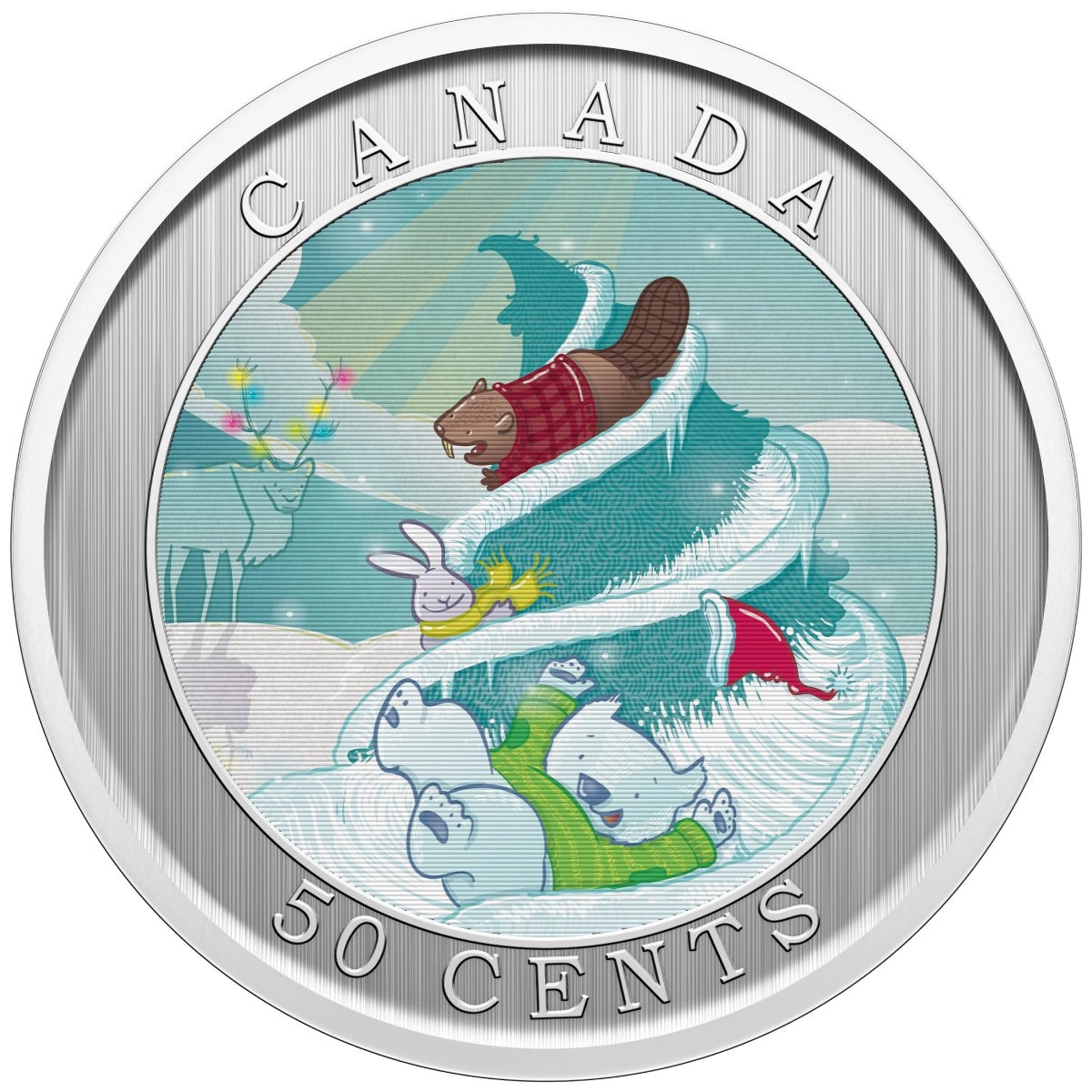 Rückseite zeigt ein lentikulares Bild fröhlicher kanadischer Tiere, darunter Churchill, der Eisbär, die die Rutschbahn hinuntersausen. Das Bild verändert sich mit der Bewegung und erzeugt eine Illusion von Bewegung. Diese Seite trägt auch die Aufschrift „CANADA“ und den Nennwert „50 CENTS“.