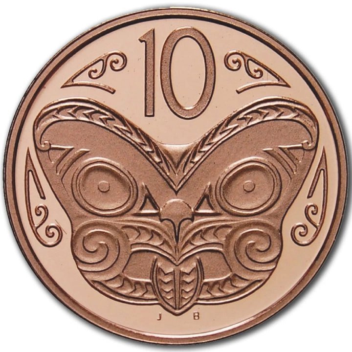 The reverses show the denomination information. The coins depict, in sequence, a white heron -The kōtuku, a kiwi, a ship - HMS Endeavour, a sculpture depicting an 18th century Maori leader called 'Pūkākī', a carved Maori mask or 'kōruru' with Maori rafter patterns.