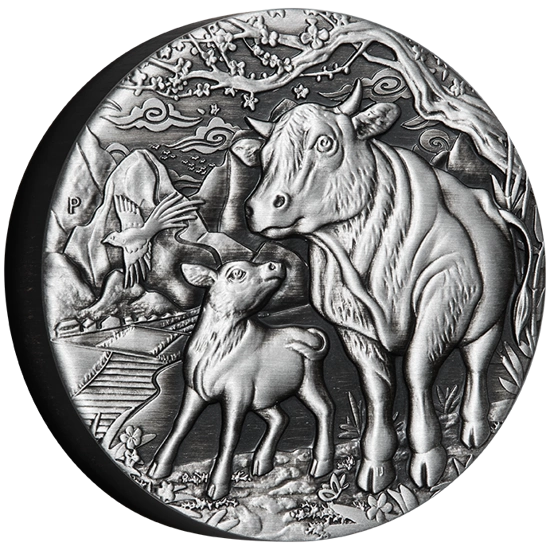 Srebrna moneta Rok Bawoła to drugi egzemplarz tworzący kolekcjonerską odsłonę serii Lunar III. Drugi egzemplarz pochodzący z 3 edycji księżycowej kolekcji jest produktem posiadającym wykończenie „Antiqued Finish". Ta dwuuncjowa moneta została wybita przez The Perth Mint z czystego srebra próby Ag.9999, o średnicy liczącej 40,69mm.