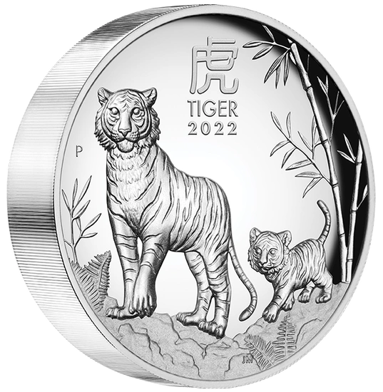 Rewers ukazuje dumnego, dorosłego tygrysa wraz z małym tygryskiem. Na rewersie znajduje się również chiński znak „tygrys”, napis „TIGER 2022” oraz litera "P", czyli znak mennicy The Perth Mint. Projektantką rewersu była Jennifer McKenna.