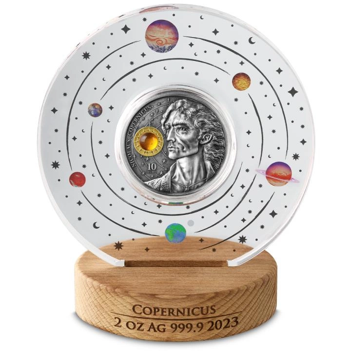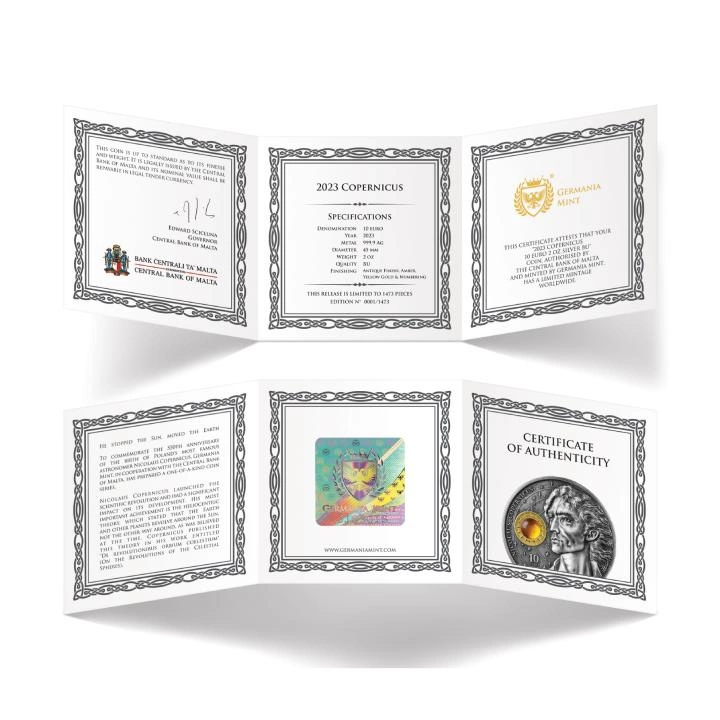 Malta: Kopernikus vergoldet 2 Unzen Silber 2023 Antique Finish ist ein einzigartiges Produkt zum Gedenken an den 550. Jahrestag der Geburt von Nikolaus Kopernikus, dem bedeutenden Astronomen, Begründer der heliozentrischen Theorie, Arzt und Wirtschaftswissenschaftler. Von ihm stammt eine Version des Gesetzes über den Geldumlauf - "Schlechteres Geld verdrängt immer besseres". Die Münze zeigt zusätzlich Bernstein, der auf der Vorderseite sichtbar ist