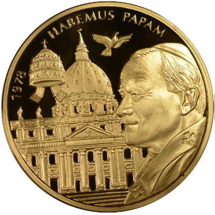 Auf der Rückseite der Goldmünze ist ein Bild von Johannes Paul II. mit dem Petersdom im Hintergrund abgebildet. Die Vorderseite trägt die Inschrift "HABEMUS PAPAM 1978".