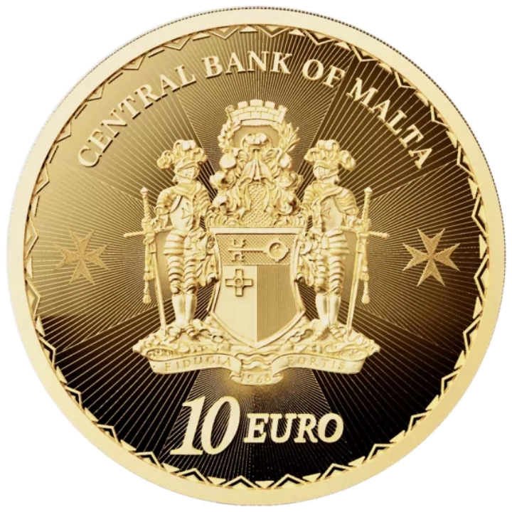 Die Rückseite der Goldmünze zeigt das Wappen der maltesischen Zentralbank. Die Rückseite trägt außerdem die Aufschrift CENTRAL BANK OF MALTA" und Angaben zum Nennwert.