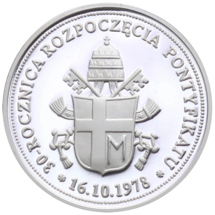 Rückseite der Medaille zeigt das Wappen von Johannes Paul II. sowie die Inschrift „30-JAHRESTAG DES BEGINNS DES PONTIFIKATS“.