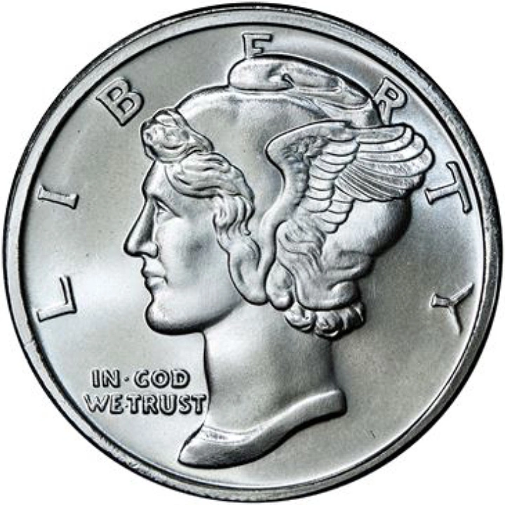 Die Vorderseite der Silbermünze zeigt ein Porträt des Gottes „Merkur“ mit charakteristischen kleinen Flügeln sowie die Inschriften „LIBERTY“ und „IN GOD WE TRUST“.