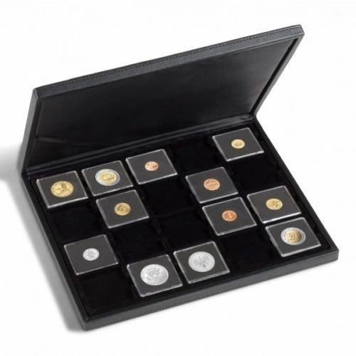 Ekskluzywny holder Presidio Trio wykonany z cimnogranotwej wyściółki. Holder służy do przechowywania 20 kapsli typu QUADRUM . Kaseta wyposażona w ciemno granatową powierzchnię welurową i 20 portów kwadratowych (50 x 50 mm). Poduszka pokryta tapicerowaną czarną satyną.