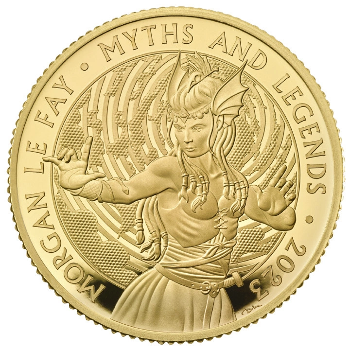 Die Mythen & Legenden Goldmünze: Morgan Le Fay 1/4 Unze Gold 2023 Proof zeigt eine der Figuren der Artussage, unzähliger Legenden, literarischer Werke und Filme. Von der viktorianischen Ära bis zur amerikanischen Literatur des neunzehnten und zwanzigsten Jahrhunderts wird sie häufig als verachtenswerte Figur dargestellt, die oft versucht, Artus zu schaden.