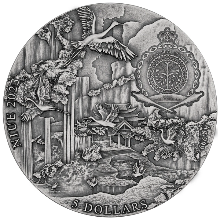 Vorderseite: Die Vorderseite der Silbermünze zeigt das Wappen von Niue sowie einen Teil der Residenz der Götter mit Reihern und enthält Angaben zum Nennwert, Ausgabedatum, Gewicht und Metallreinheit.