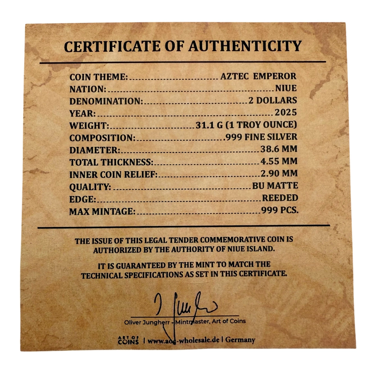 Rückseite: Die Rückseite zeigt das mexikanische Staatswappen – einen Adler auf einem Kaktus mit einer Schlange im Schnabel, eines der bekanntesten Symbole des Landes. Unter dem Wappen befinden sich die Angaben zum Gewicht und zur Feinheit: „1 OZ 999 FINE SILVER“. Oben sind der Ausgeber „NIUE“, der Nennwert „TWO DOLLARS“ sowie erneut das Ausgabejahr „2025“ zu sehen. Die Verbindung klassischer mexikanischer Motive mit Merkmalen der Pazifikinseln macht diese Münze zu einem besonderen Beispiel für einen interkulturellen Tribut an Geschichte und Erbe.