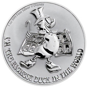 Die Rückseite der Silbermünze ist mit einem Bild von Dagobert Duck und der Aufschrift "I'M THE RICHEST DUCK IN THE WORLD" verziert. Auf der Rückseite sind auch das Gewicht, der Prägewert und das Disney-Logo zu lesen.