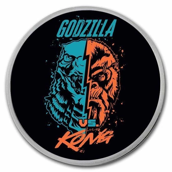 Niue: Godzilla vs. King Kong 2021 to kolorowana moneta, która jest częścią kolekcji Godzilla vs. King Kong. Ten srebrny egzemplarz jest produkowany z czystego srebra próby Ag.999, o wadze jednej uncji trojańskiej oraz średnicy liczącej 39 mm. Co ważne, srebrna moneta Godzilla vs. King Kong posiada limitowany nakład liczący zaledwie 10 000 sztuk, a co więcej każda sztuka jest dostarczana w prezentacyjnym slabie.
