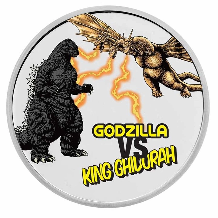 Niue: Godzilla vs Monsters - King Ghidorah coloured 2 oz Silver 2023 ist die erste Münze der Serie "Godzilla vs Monster". King Ghidorah ist ein zweibeiniger, laufender Drache mit drei gehörnten Köpfen mit Stacheln auf langen Hälsen, die an orientalische Drachen erinnern. Seine vorderen Gliedmaßen sind zu häutigen Flügeln umgewandelt. Im Film Godzilla gegen King Ghidorah wird er zu einem Cyborg.