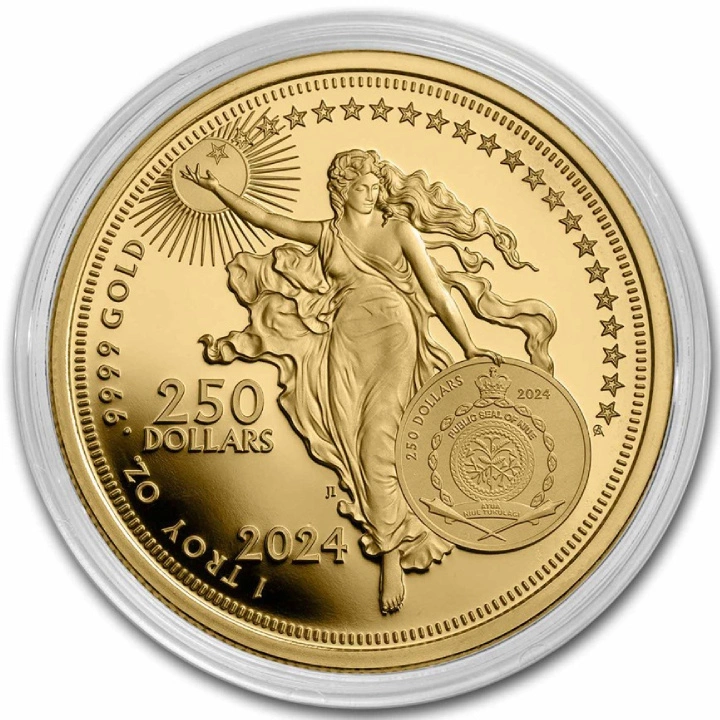 Die Vorderseite zeigt das Bild der Göttin der Freiheit, das Wappen von Niue sowie Angaben zu Gewicht, Feingehalt des Goldes, Ausgabejahr und Nennwert der Münze.