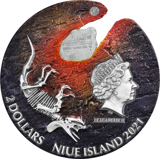 Srebrna, bulionowa moneta Niue: Impact Moments - Meteorite kolorowany 2 uncje Srebra 2021 High Relief Antique Finish przedstawia motyw, który nawiązuje do wyginięcia dinozaurów, poprzez uderzenie meteorytu w kulę ziemską 66mln lat temu.