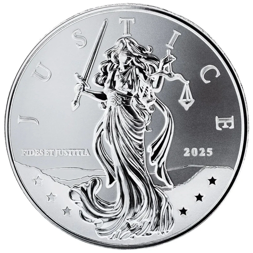 Revers zeigt die majestätische Figur der Lady Justice, die Gerechtigkeit und moralische Integrität verkörpert. In der einen Hand hält sie das Schwert der Wahrheit, in der anderen die Waage der Gerechtigkeit, während die Augenbinde Unparteilichkeit symbolisiert. Die Komposition wird von der Inschrift „JUSTICE“ und dem lateinischen Motto „FIDES ET JUSTITIA“ umrahmt. Der Hintergrund ist mit fein gravierten Sternen und Linien verziert, die der Münze außergewöhnliche Tiefe und Brillanz verleihen.