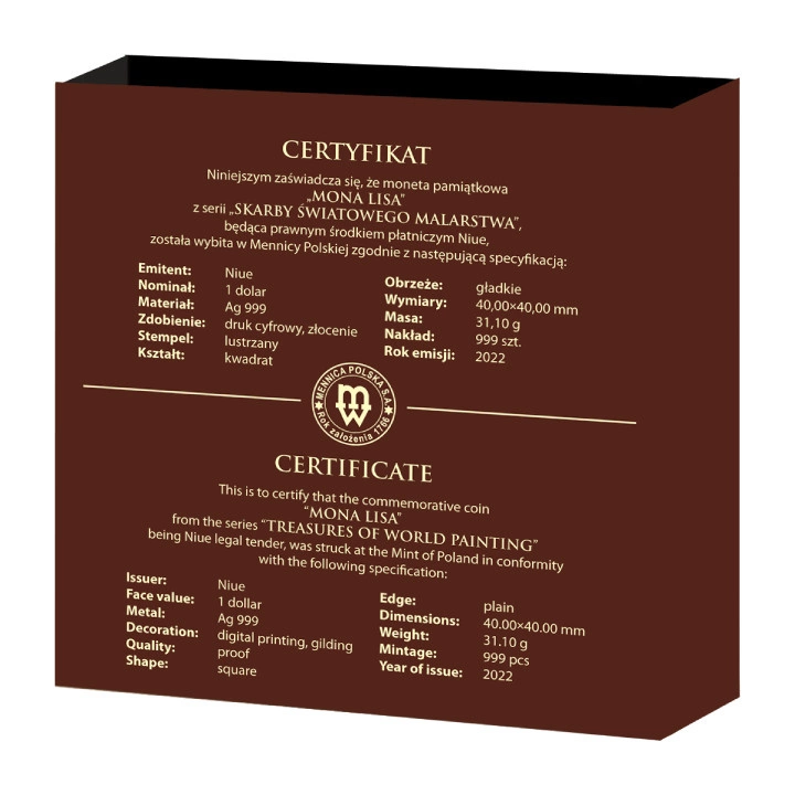 Die Münze ist in Ag.999 Sterlingsilber geprägt, wiegt 1 Feinunze, misst 40 x 40 mm und ist im Proof-Standard. Darüber hinaus ist die Münze in Gelbgold vergoldet. Der ausgezeichnete Hersteller "Mint of Poland" ist für die limitierte Ausgabe von 999 Stück verantwortlich. Das Produkt wird in einer individuellen Originalverpackung geliefert. Die Münzen sind im Ausgabeland gesetzliches Zahlungsmittel.