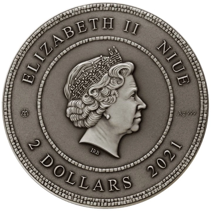 Auf der Umseite der Silbermünze ist das Wappen von Niue abgebildet sowie Angaben zum Nennwert, zum Feingehalt des Barrens und zum Prägejahr der Münze.