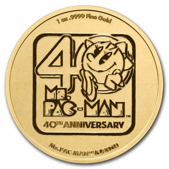 Niue: Ms.PAC-MAN 40. rocznica 1 uncja Złota 2021 to kolekcjonerska moneta upamiętniająca kultową, zręcznościową grę wideo. Ms.PAC-MAN została stworzona przez Midway w 1981 roku. Ms.PAC-MAN różni się od PAC-MAN'a tym, że w roli głównej występuje postać płci żeńskiej.