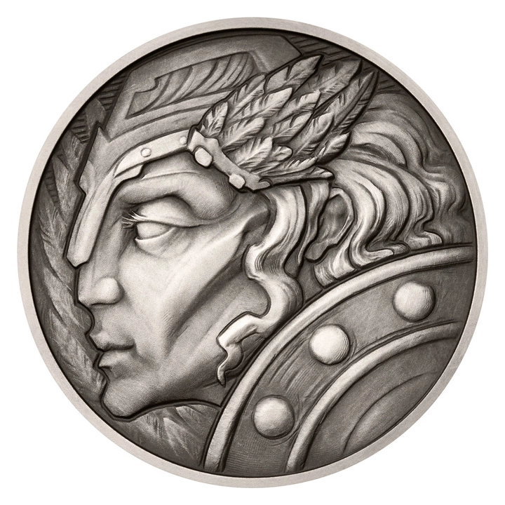 Rückseite zeigt den Kopf der Walküre mit Helm und unterstreicht ihre Stärke sowie den mythologischen Charakter der Münze.