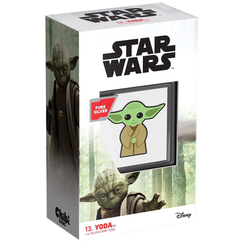 Yoda Chibi Coin coloriert 1 Unze Silber 2022 Proof ist eine Münze aus der Serie Star Wars – Chibi Coins. Die Münze zeigt den Jedi-Meister Yoda im charakteristischen Chibi-Stil, mit großem Kopf und relativ kleinem Körper, was der Figur einen niedlichen und verspielten Look verleiht. Die Münze wurde von der New Zealand Mint aus einer Unze 99,9 % Silber in Proof-Qualität geprägt. Die Auflage ist weltweit auf 2.000 Stück limitiert, und jedes Exemplar wird in der Originalverpackung mit Echtheitszertifikat geliefert.