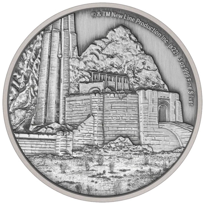 Niue: Der Herr der Ringe - Helm's Deep 3 oz Silber 2022 Antique Finish ist ein interessantes Silberstück für Sammler und Fans der Herr der Ringe Trilogie. Die Münze wurde in Zusammenarbeit mit Warner Bros. Consumer Products hergestellt und zeigt die große Festung Hornburg in Helmswerft.