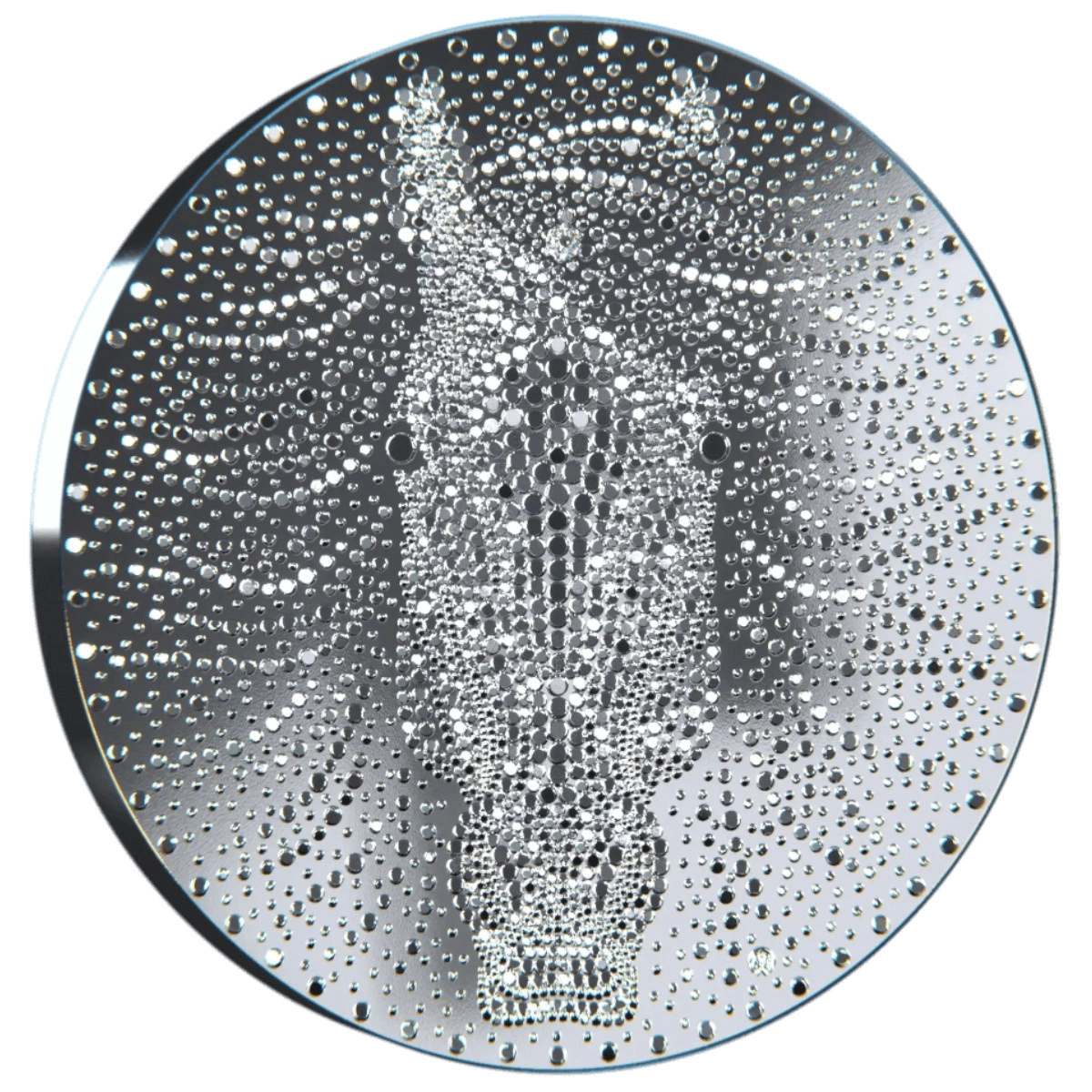 Das Design zeigt den Kopf eines Pferdes, der nach vorne gerichtet ist – ruhig, selbstbewusst und würdevoll. Dieses Motiv, das in der gesamten Serie wiederkehrt, steht für Ausdauer, Unabhängigkeit und Entschlossenheit. Die Oberfläche der Münze ist mit Tausenden winziger Kreise verziert, die das Licht reflektieren und einen funkelnden Effekt erzeugen, der das Abbild des Pferdes lebendig erscheinen lässt.
