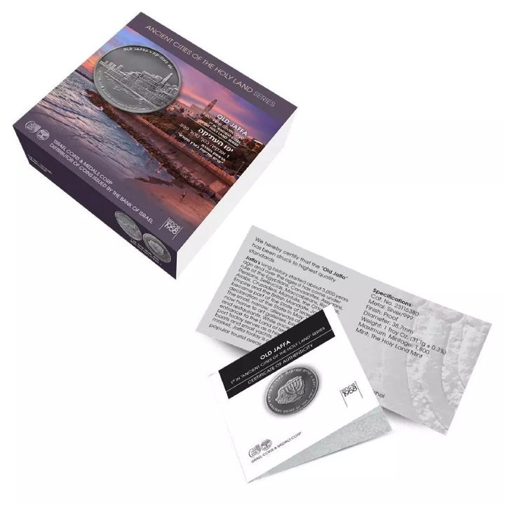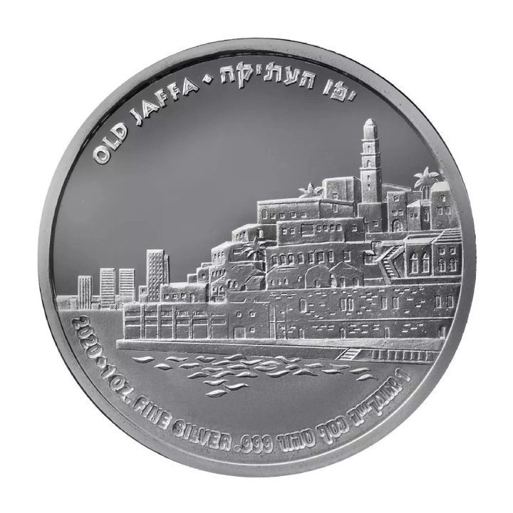 Old Jaffa 1 oz Silver 2020 Prooflike 1 Münze aus der Serie "Ancient Cities of The Holy land". Jaffa, das auf einem Hügel an der israelischen Küste südlich des heutigen Tel Aviv liegt, entwickelte sich zu einer der wichtigsten Hafenstädte am Mittelmeer.