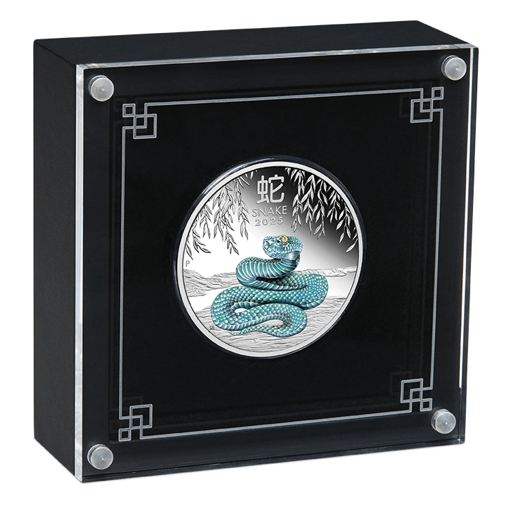 Perth Mint: Lunar III – Jahr der Schlange 1 Unze Silber 2025 Proof ist die sechste Ausgabe des Lunar III-Serie. Die vorherigen Münzen der Serie waren das Jahr der Maus 2020, das Jahr des Büffels 2021 und das Jahr des Tigers 2022, das Jahr des Kaninchens 2023, das Jahr des Drachen 2024. Die Mondserie bezieht sich auf 12 Tiere sind Vertreter des chinesischen Mondkalenders.