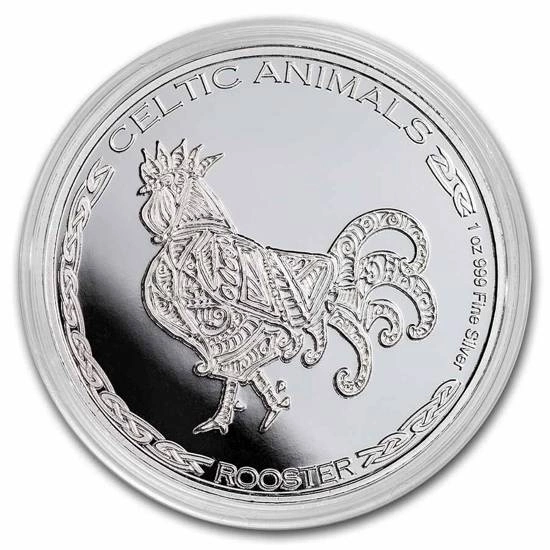 Keltische Silbermünze: Celtic Animals - Rooster 1 oz Silver 2022 ist ein weiteres Stück aus der einzigartigen Serie Celtic Animals der Republik Tschad. Auf der Münze ist ein Hahn abgebildet. Diese Anlagemünze wird in Ag.999-Sterlingsilber geprägt, wiegt eine Feinunze und misst 39 mm im Durchmesser.