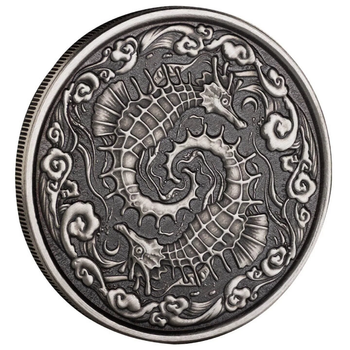 Die Samoa: Seepferdchen 1 oz Silber 2023 Antikmünze ist ein Stück aus der Serie 'Samoa Seepferdchen'. Das Produkt zeigt ein Seepferdchen - ein Seepferdchen, das sich durch sein außergewöhnlich zartes Aussehen und seine schlanke Silhouette auszeichnet. Die Münze wurde aus reinem Ag.999-Silber mit einem Gewicht von einer Feinunze und einem Durchmesser von 39 mm in antikisierter Ausführung geprägt.