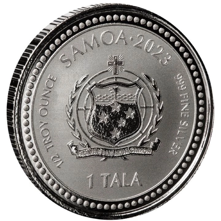 Die Vorderseite der Silbermünze zeigt das Wappen Samoas und die Aufschrift "SAMOA 2023". Die Vorderseite enthält außerdem Informationen über das Ausgabeland, den Nennwert der Münze, das Gewicht und den Feingehalt des Barrens.