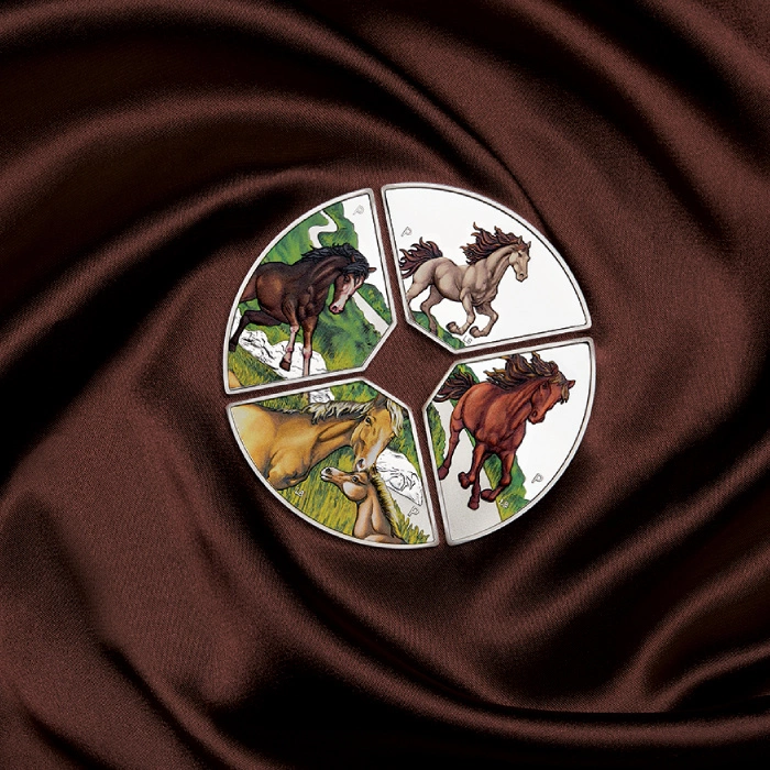 Das Ensemble besteht aus vier Silbermünzen, die zusammen einen Kreis mit einem Quadrat in der Mitte bilden – inspiriert von der Form der ersten chinesischen Währung „Ban Liang“, die während der Qin-Dynastie um 200 v. Chr. eingeführt wurde. Das Design ehrt die Bedeutung des Pferdes in der chinesischen Tradition, eines der zwölf Tiere des legendären Großen Rennens des Kaisers, das die Reihenfolge der Tierkreiszeichen festlegte.