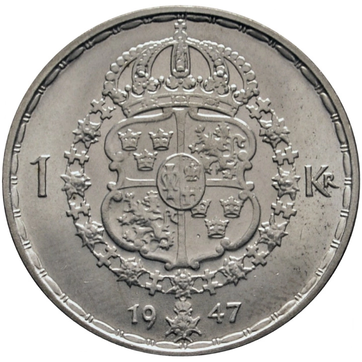 Rückseite zeigt das Wappen von Schweden, umgeben von der Kette des Seraphinenordens, der den Nennwert und das Ausgabejahr trennt. Die Münze zeigt die Aufschrift "1 KR" sowie das Ausgabejahr.