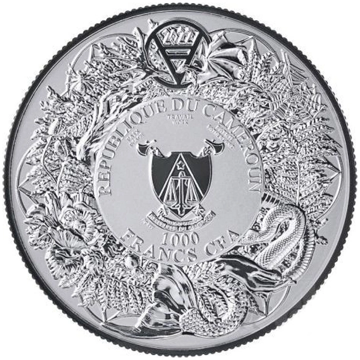 Die Rückseite der Silbermünze ist mit dem Wappen der Republik Kamerun verziert und enthält Angaben zum Nennwert, zum Proof und zum Ausgabejahr.